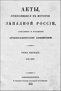 - Акты, относящиеся к истории Западной России, собранные и изданные Археографической комиссией. — Т. 1. – СПб., 1846. — 432 c.