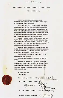 ДИРЕКТОРІЯ ОПОВІЩАЄ НАРОД УКРАІНСЬКІЙ ПРО ВЕЛИКУ ПОДІЮ В ІСТОРІІ ЗЕМЛІ НАШОІ УКРАІНСЬКОІ.
