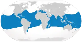 Зустрічається повсюди в тропічній зоні. Харчується рибами і кальмарами, іноді молюсками, також будь-якими доступними покидьками.