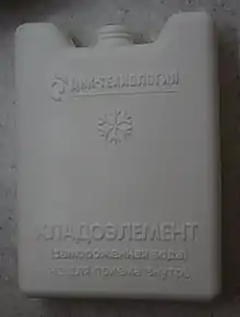- Водо-солевий акумулятор — це пластикова ємність з сольовим розчином, підтримує температуру в межах від -20 до +8 °C. Функції активної речовини у водо-солевих акумуляторах виконує зазвичай 2%-ний водний розчин Na-карбоксиметилцелюлози.