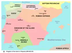 Восени 409 року алани в союзі з вандалами і свебами вторглися до Римської Іспанії (сучасний Піренейський півострів), пройшовши через Галлію (сучасну Францію)[12].