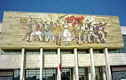 - Sawyer, 2014, p. 122. «In Tirana, Albania's National History Museum, itself a product of Hoxha's regime, reaches back to antiquity in a notable mural above the entrance, yet the central figure (a woman) is flanked by a worker and a partisan, making this ultimately a modern moment.»