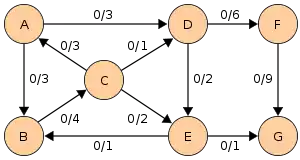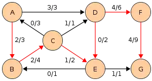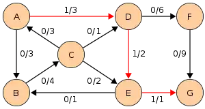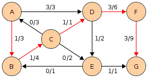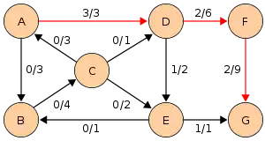 Нехай задана мережа з витоком у вершині і стоком в вершині . На малюнку парою позначений потік по цьому ребру і його пропускна спроможність.