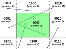 Алгоритм поділяє площину на 9 частин прямими, які утворюють сторони прямокутника. Кожній з 9 частин присвоюється чотирьохбітний код. Біти (від молодшого до старшого) означають «лівіше», «правіше», «нижче», «вище». Іншими словами, у тих трьох частин площини, які зліва від прямокутника, молодший біт дорівнює 1, і так далі.