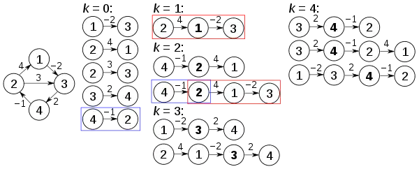 Перед першою ітерацією циклу, тобто при , усі відомі шляхи відповідають одиничним ребрам у графі. Після кроку алгоритм знаходить шляхи, які проходять через вершину . Зокрема, шлях замінить шлях , що проходить через меншу кількість ребер, але є довшим (у сенсі ваги). Після знайдено шляхи, що проходять через вершини . Червоні та блакитні обведення показують, як шлях складається зі шляхів та , визначених на попередніх ітераціях. Шлях не розглядається, тому що найкоротшим шляхом від до на даному етапі є . Після знайдено шляхи, що проходять через . Нарешті, після , знайдено всі найкоротші шляхи.