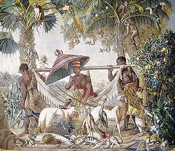 До таких алегорій належить також гобелен «Нова Індія» (Музей історії мистецтв, Відень). Ми бачимо царствену особу, яку несуть два раби. На тлі – фантастичні дерева і кущі, мавпи, екзотичні птахи, реальні і фантастичні. Але ліворуч добре видно реалістичне стебло кукурудзи, яку привезли в Європу з Америки – Нової Індії. Понизу велика кількість риб і моських істот, що відтворювали природні багатства нововідкритих земель. Кількість деталей надмірна, бо художник-картоньєр прагне створити святкове враження на глядача, примушуючи і його милуватись усім розмаїттям плодів, рослин, моських чи екзотичних наземних тварин.