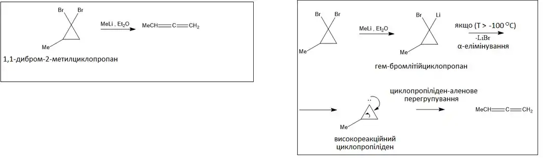 2. При дії (наприклад, метил літієм) на 1,1-дихлор- або 1,1-дибромциклопропани алкіллітієвих сполук з хорошими виходами отримуються алени (Мур і Вард, 1961 р.; Скаттебел, 1961 р.)[1].