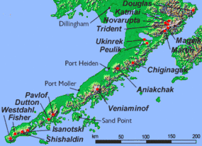 ![]() Мапа з позначенням вулканів на півострові Аляска Мапа з позначенням вулканів на півострові Аляска | ||||
