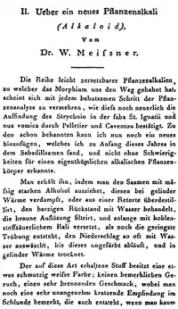 Значний доробок у хімію алкалоїдів на зорі її розвитку зробили французькі дослідники П'єр Пеллетє і Жозеф Каванту, які відкрили, зокрема, хінін (1820) і стрихнін (1818). Також протягом декількох наступних десятиліть були виділені ксантин (1817), атропін (1819), кофеїн (1820), коніїн (1827), нікотин (1828), колхіцин (1833), спартеїн (1851), кокаїн (1860) та інші[13].
