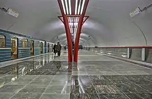 Архітектура максимально лаконічна. Станційний зал перекритий пологим гладким, еліпсоподібним по обрису склепінням. Колійна стіна оздоблена сірими гранітними плитами. Межа склепіння та колійної стіни підкреслена червоною лінією (фарбована металева труба). На підлогах плитами світлого і темного граніту викладений шаховий геометричний малюнок. У цілях безпеки краї платформи позначені смугами контрастного граніту і світлодіодними смугами.