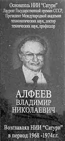 В Києві, на проспекті Леся Курбаса, 2б, на фасаді ВАТ НВП «Сатурн», засновником і керівником якого був Володимир Алфеєв, встановлено гранітну меморіальну дошку.