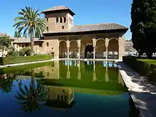 «Назва „Парталь“ (Partal, від арабського слова, що означає „портик“). Значну її частину раніше становив палац Парталу (Palacio del Partal), або палац Портик (Palacio del Pórtico), побудований раніше насридських палаців — на початку XIV ст., за Мухаммеда III. Від цього палацу залишилося дуже небагато; найбільша з його будов — вежа Дам (Torre de las Damas), або башта Князя (Torre del Príncipe), вбудована в зовнішню стіну. Її портик з п'ятьма арковими входами виходить до прямокутної водойми, як і в інших палаців. Внутрішнє оздоблення теж схоже: різнокольорові кахлі низом стін, над ними гіпсова ліпнина, дерев'яна стеля.»