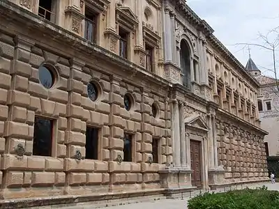 «Палац Карла V (Palacio de Carlos V) почав будуватися архітектором Педро Мачука для імператора поряд з палацами Насридів у 1527 р, але в 1568 р будівництво було призупинено на 15 років через повстання морісків. Ренесансна архітектура палацу в дусі італійського маньєризму (архітектор довго жив в Італії) різко контрастує з сусідніми будівлями. Втім, палац добудовувався аж до 1957 р., від чого несе відбиток різних епох. Палац квадратний у плані (63 х 17,4м), але має внутрішній круглий двір (діаметром 30 м). Має два поверхи, на фасадах яких пілястри чергуються з парами вікон — прямокутним і зверху круглим. Перший поверх виконаний у стилі тосканського ордеру і рустований, до пілястр прикріплені декоративні залізні кільця для прив'язування коней. На другому поверсі зроблено ряд балконів, його вікна багатше оздоблені, пілястри — іонічного ордера.»