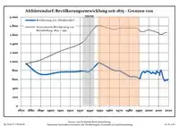 Динаміка населення з 1875 року в сучасних кордонах (Синя лінія: населення; Пунктир: відносна порівняльна динаміка населення землі Бранденбург; Сірий фон: період Третього рейху; Помаранчевий фон: період НДР)
