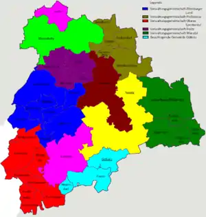 Район складається з п'яти міст, трьох самостійних громад (нім. Gemeinden), а також 30 громад, об'єднаних у 5 об'єднань громад (нім. Verwaltungsgemeinschaften).