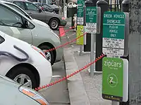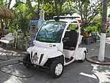 ![]() GEM e2 на зарядці. Авто використовуються туристичною поліцією в Плайя дель Кармен, Мексика. |