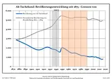 Динаміка населення з 1875 року в сучасних кордонах (Синя лінія: населення; Пунктир: відносна порівняльна динаміка населення землі Бранденбург; Сірий фон: період Третього рейху; Помаранчевий фон: період НДР)