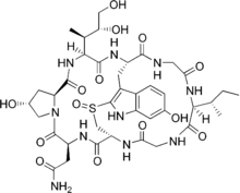 Структура цього поліпептиду є нетиповою зпосеред більшості поліпептидів, це пов’язано з розгалуженням амінокислотного ланцюга. Поперечний місток між 6-гідрокси-триптофаном та цистеїном утворює друге "внутрішнє кільце", як видно на структурній формулі сполуки. "Зовнішнє кільце" сформоване звичайними пептидними зв’язками амінокислотного ланцюга.