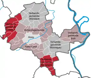Район складається з 68 міст і громад (нім. Gemeinden), об'єднаних в 6 об'єднань громад (нім. Verbandsgemeinden), а також районного центру, міста Альцай, яке до жодного об'єднання адміністративно не входить.