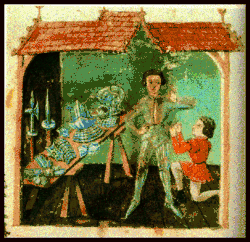 Лицар убирається в обладунки. Зліва видно полекс і альшпіс.