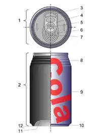 Алюмінієвий лист попадається у прес, який вибиває з нього кружки, які служитимуть заготовками для виробництва бляшанок. Штампувальний прес виконує дві операції: він вибиває диск (кружки) діаметром 14 сантиметрів і придає їм чашеподібну форму.[1] Після цього вони потрапляють у машину, яка розтягує алюміній і утворює корпус банки. При розтягуванні, в машину подається змазка, щоб алюміній не розривався. Ця змазка одночасно відіграє роль охолоджувача, бо алюміній при розтяжці нагрівається. На сформованих корпусах очищаються і вирівнюються краї. Перевернуті вверх дном бляшанки подаються в машину для миття. Миття проводиться у 6 етапів: перші два — миття соляною кислотою підігрітою до 60 °C, наступні чотири — миття деіонізованою водою, нейтральною водою з нульовим водневим показником при температурі 60 °C.[1] Після цього бляшанки потрапляють в сушильну машину. На цьому етапі бляшанка блищать, бо соляна кислота видалила тонкий шар алюмінію з поверхні. Валик покриває дно бляшанок шаром лаку. Це покриття дозволяє бляшанкам легко ковзати на конвеєрах та торгових автоматах, а в ультрафіолетових променях світиться блакитним кольором. На бляшанки наносять написи високошвидкісною (1800 штук за хвилину) ротаційною друкувальною машиною (система може наносити по-черзі до 5 фарб) і захисний шар лаку.[1]