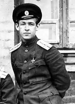 За бойові заслуги, як повний Георгіївський кавалер, 19 листопада 1915 року наказом Південно-Західного фронту був удостоєн офіцерського чину прапорщика інженерних військ, зі старшинством з 12 листопада 1915 (затверджено імператорським наказом від 10.03.1916). У званні військового льотчика був на посаді молодшого офіцера авіаційного загону.