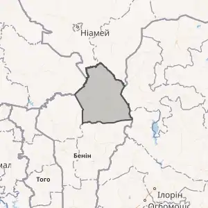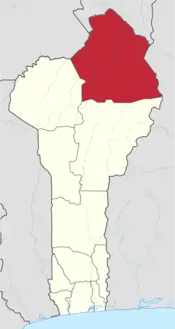 Знаходиться на північному сході країни. Межує з Буркіна-Фасо та Нігером з півночі, з Нігерією - зі сходу. На півдні межує з департаментом Боргу, на заході - з департаментом Атакор.