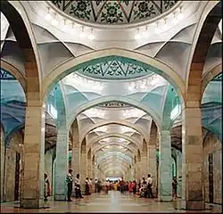 Інтер'єр станції прикрашений орнаментом гіріх та іслімій роботи художників Р. Мухамаджонова і А. Рахімова. Карнизи прикрашені традиційним національним орнаментом, роботи майстра І.Шермухамедов. У стінах залу встановлено панно із сюжетів «Хамси» Навої і барельєф Навої, художників Ч. Ахмарова та І. Каюмова, майстрів по гіпсу А. Аминова і У. Маматбоева, скульптора А. Шаймурадов. Стелі на станції куполоподібні і прикрашені візерунками, а також яскраво підсвічені.