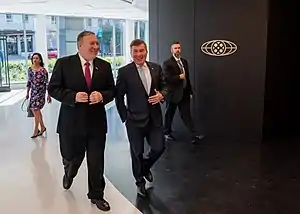 ![]() Держсекретар США Майк Помпео під час відвідин штаб-квартири «Асоціації кінокомпаній» у Вашингтоні. 12 вересня 2019 року | |
