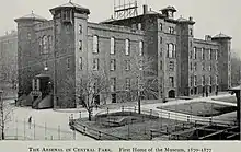 У 1874 році був закладений наріжний камінь для першої будівлі музею, яка зараз прихована від очей багатьма будівлями комплексу, які сьогодні займають більшу частину площі Манхеттен. Оригінальна вікторіанська готична будівля, яка була відкрита в 1877 році, була спроєктована Калвертом Воксом та Дж. Врі Молдом, обидва тісно ототожненими з архітектурою Центрального парку.[9]