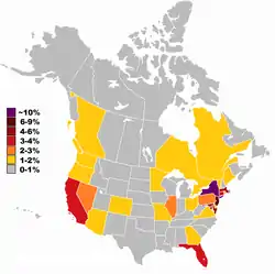 ![]() Канадські та американські євреї як % населення за штатом/провінцією | |