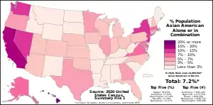 За даними перепису 2010 року, американці азійського походження становили 5,6% населення США. Найбільшими національними групами серед них були китайці (22% від загальної чисельності осіб азійського походження), філіппінці (20%), індійці (18%), в'єтнамці (10%), корейці (9%) і японці (7%). За 30 років (з 1980 по 2010 роки) чисельність азіатів в США зросла в 5 разів (з 3,5 млн до 17,3 млн.).