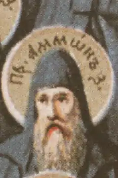 В іконописному оригіналі кін. XVIII ст. про вигляд святого Амона сказано: «Сед, брада аки у Сергия, на конце поуже, на главе клабук черн, риза преподобническая, испод празелен».