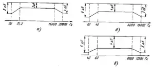 Поле допусків АЧХ за ГОСТ 23263-83 для а) вищої групи складності б) 1-ї групи складності в) 2-ї групи складності