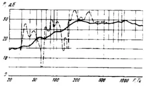 АЧХ гучномовця, виміряна в незаглушеному (штрих), та заглушеному (нерозривна лінія) приміщенні