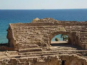 Амфітеатр був побудований на березі Середземного моря в нижній частині міста для більш легкого доступу до нього мешканців міста. Він розташований на крутому схилі, тому частина трибун вирізана в скелях, інша частина трибун зведена на склепіннях. Для будівництва використовувався як бетон, так великі кам'яні блоки.