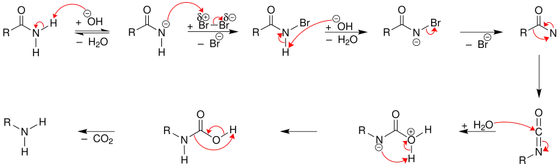 Аміни також отримують дією на аміди карбонових кислот розчинів брому (хлору) у гідроксиді калію (натрію); ця реакція відома як перегрупування за Гофманом. Вона протікає в декілька етапів: