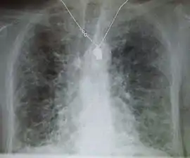 - З боку дихальної системи — дуже рідко (менше 0,01%) бронхоспазм, легеневі кровотечі, ексудативний плеврит, фіброз легень, для опису яких використовується термін «аміодарон-індукована легенева токсичність». Найважчими побічними ефектами аміодарону з боку дихальної системи є гострий респіраторний дистрес-синдром та облітеруючий бронхіоліт з пневмонією, які часто закінчуються смертю (5—15% хворих).[9]