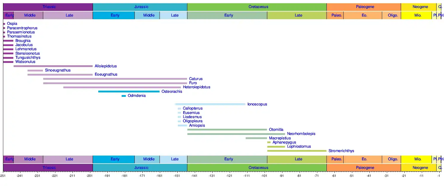 - Рід Caturus Agassiz 1834 (синоніми = Conodus, Ditaxiodus, Endactis, Strobilodus, Thlattodus)(гомонім = Uraeus Agassiz 1833)