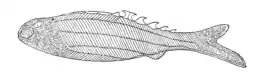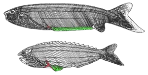 ![]() Pharyngolepis (згори) та Rhyncholepis (знизу). Червоним позначено трипроменевий шип, зеленим — плавцеві складки | ||||||||||||||||