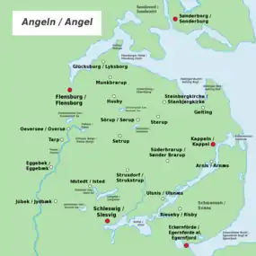 Здавна півострів був заселений германськими племенами англів. Згідно з Англосаксонськими хроніками, написаними 890 року, англи переселилися звідси у 449—455 роках на острів Велика Британія на запрошення короля Вортіґерна, який запропонував їм землі за допомогу у боротьбі проти піктів.