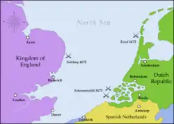 У 1672 році Англія оголосила війну Республіці Об'єднаних провінцій. Приводом став заколот проти Яна де Вітте, внаслідок якого Вільгельм III Оранський став штатгальтером, що суперечило Вестмінстерському мирному договору. Невдовзі у війну на боці Англії вступила Франція (війна з нею відома як Голландська). До антиголландської коаліції долучилося єпископство Мюнстер і архієпископство Кельнське. Голландія опинилася в край складній ситуації: вона вимушена була діяти на морі і суходолі, фактично оточена з усіх боків. Водночас тривав конфлікт в середині країни, де патриціат був налаштований проти оранжистів, що прийшли до влади.