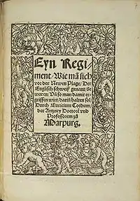 ![]() Німецький трактат про «нову чуму — англійську пітницю», виданий Еврицієм Кордом (Генрихом Ритце) в 1529 году Німецький трактат про «нову чуму — англійську пітницю», виданий Еврицієм Кордом (Генрихом Ритце) в 1529 году | |