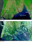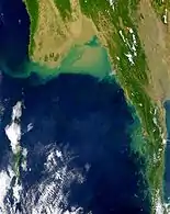 - Північні береги Андаманського моря мають генеральне широтне простягання. Від мису Пуріян і до міста Молом'ян береги потамогенні дельтові, сформовані дельтами Іраваді (31 тис. км²) і Салуїна. Тут численні низовинні (до 16 м) акумулятивні острови піщано-мулистих наносів, прорізані численними протоками й гирлами річок, заболочені ділянки яких вкриті мангровими хащами[13]. Дельта Іраваді росте в море зі швидкістю 50 м на рік[14]. У цій частині моря лежить єдина велика затока — Моутама, або Мартабан (бірм. မုတ္တမပင်လယ်ကွေ့).