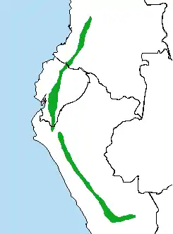 Вид поширений в Андах на півдні Колумбії, в Еквадорі та Перу. Мешкає у гірських вологих лісах. Трапляється на висотах 2000-3600 м над рівнем моря.