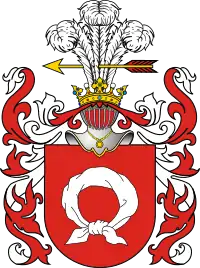 В червоному полі зображення срібної круглої зав'язаної внизу пов'язки. Клейнод: Три пера страуса, що прошиті золотою стрілою з червоним оперенням. Намет: Червоний, підбитий сріблом.
