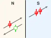 Електрон (червоний) налітає на границю між нормальним металом (N) і надпровідником (S), породжує куперівську пару у надпровіднику і повертає назад у нормальний метал дірку (зелена). Вертикальні стрілки позначають спіни частинок.