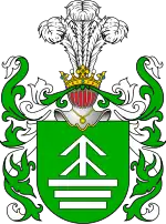 Щит увінчаний дворянським шоломом і короною. Нашоломник: три страусиних пера. Намет на щиті зелений, підкладений сріблом.