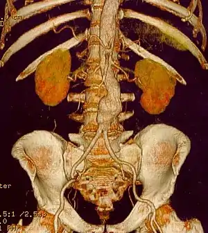 ![]() Візуалізація аневризми черевного відділу аорти за допомогою КТ. Візуалізація аневризми черевного відділу аорти за допомогою КТ. | |