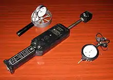 Шахтні анемометри (зліва направо — крильчастий аналоговий, крильчастий цифровий і чашковий)